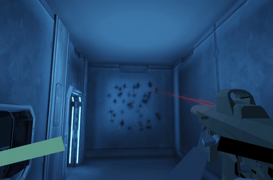 I wanted to display bullet holes on walls when they got shot at which in IRIS-04 makes use of decals. This is pretty cheap effect and useful effect which allows us to put decals on most parts of the map without seeing a noticeable performance impact.